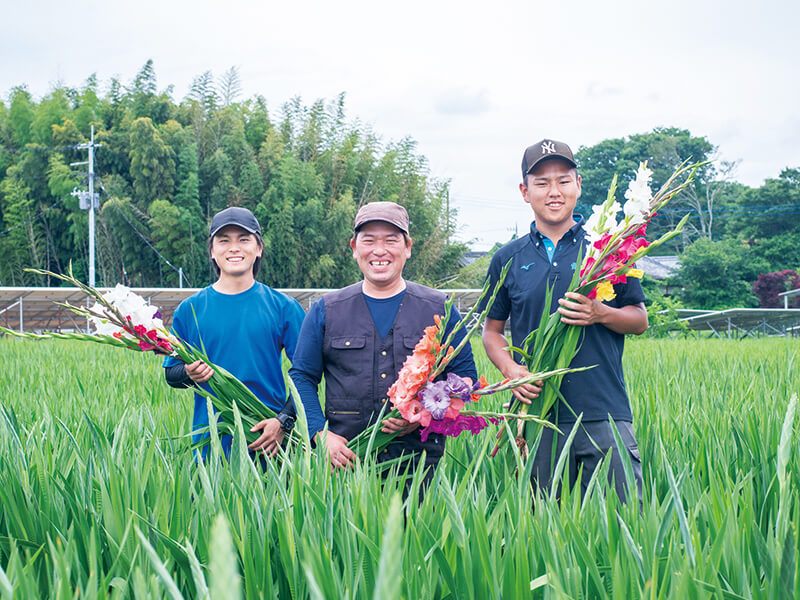 メイン画像:「かすみガウガウら協同組合」代表理事で、「小松﨑園芸」を営む小松﨑友二さん(中央)と、組合職員の三輪航太さん(左)、小泉倭人さん(右)。現在25歳の三輪さんは農業法人での研修を経て、今年、ブドウ農家として独立。週3日、組合職員として勤務しつつ自身の圃場を管理する。現在18歳の小泉さんは、週5日で勤務。「複数の品目の栽培を経験できる点が魅力で、組合に入りました」と小泉さん。
