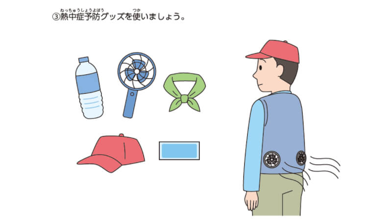 ④熱中症対策アイテムの活用 ファン付きベストや冷却タオル、塩分タブレットといった熱中症予防グッズの活用。全従業員分を一度に揃えるのが難しい場合は貸し出し制にするなど、できるところから取り入れたい。通気性のよい服装を心がけることも基本的な対策の一つ。