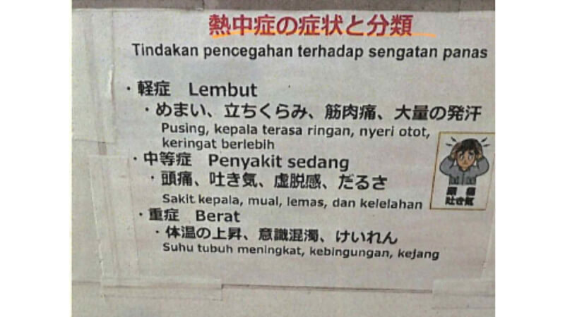 先進事例を一つ紹介する。北海道で酪農を営む株式会社Kalm角山では、数年前に別の農場で起きた外国人従業員の事故を受け、外国人には日本人以上にしっかり理解してもらわなければならないと安全対策を強化した。熱中症対策にも力を入れ、インドネシア人従業員向けに母国語で翻訳した「症状と分類」を掲示し、注意喚起を日常的に続けている。