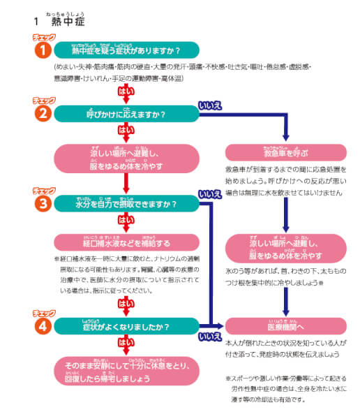 発症時の初期対応は「呼びかけに反応するか」が分かれ目になるという。反応があれば涼しい場所に避難させて休息をとる。反応がなければすぐに救急車を手配する。初動対応を日本人も外国人も誰でも行えるよう、普段から社内で確認し合う体制が重要だ。フローチャートを作成し、外国人材向けには母国語に翻訳して配布することを勧めている。