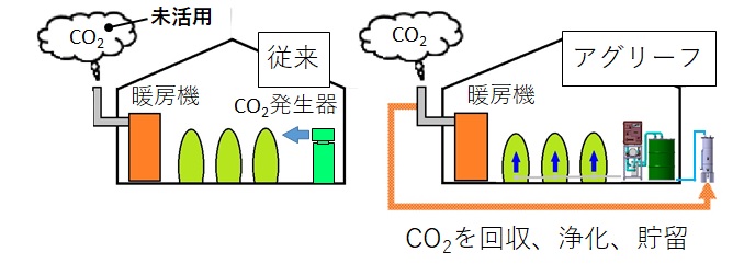 従来捨てられていた暖房機の排気ガスを利用しCO2を貯留、再利用できます。