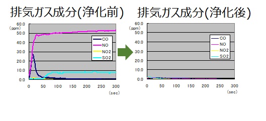 排気ガスの浄化には、当社が自動車部品製造で培ってきた技術を活かしています。排気ガスにはNOx、SOx、COが含まれますが、施用されるCO2では検出限界(検出できない濃度)にまで浄化され、灯油燃焼式CO2施用機より遥かに清浄になります。作物に臭いが付くこともありません。なお、本機が対応するのはローサルファA重油を燃料とした暖房機の排ガス。ハイサルファA重油と灯油が燃料の暖房機には対応していません。