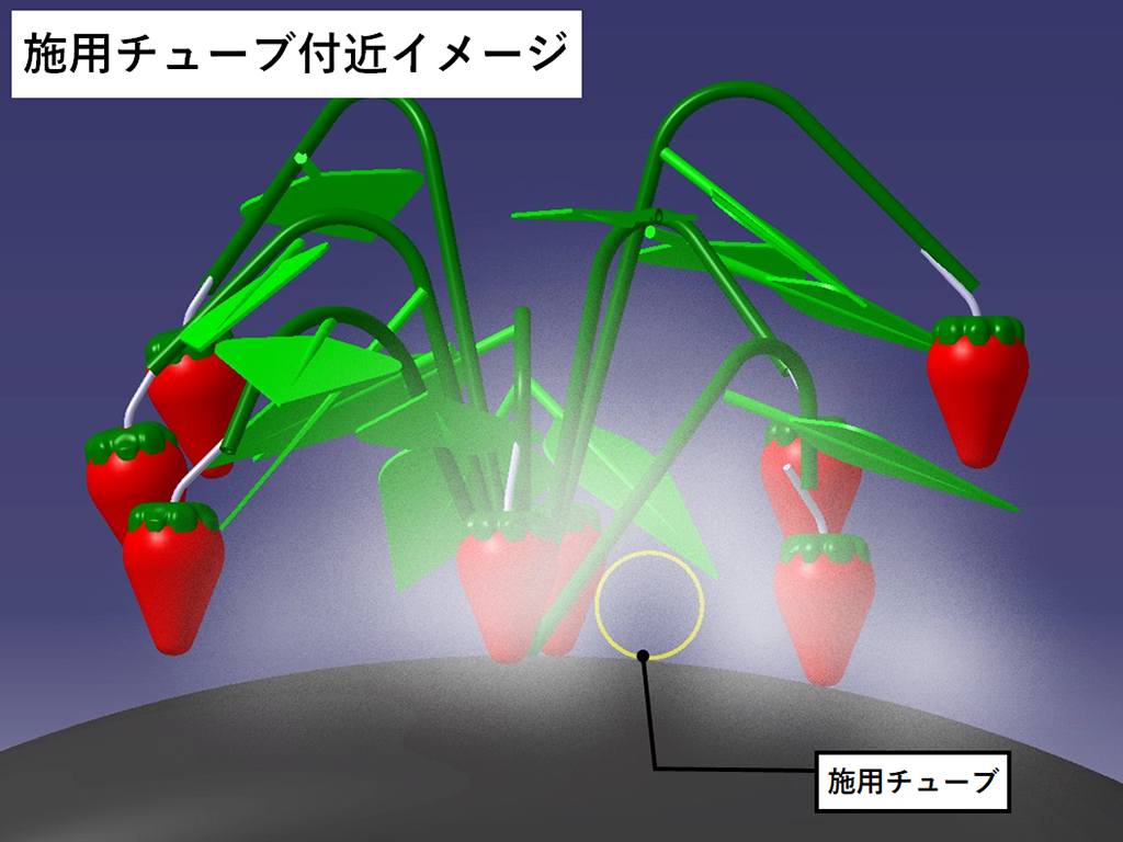 植物の群落至近にCO2を供給する局所施用のため、植物にCO2を効率的かつムラなく届けることが可能。暖房機が稼働しない夏場は群落内に空気を送風します。葉面付近は植物が繁茂するとCO2濃度が低下しますが、通気性を高めることでCO2を届けることができ、同時に病害虫発生の抑制効果も見込めます。また、施用するCO2はタンクに貯留されている間に温度が下がり常温となるため、作業者の方々にはとても快適です。