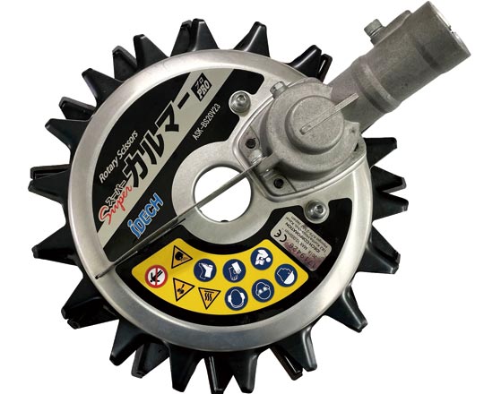 従来の草刈り作業の「小石や欠けた刈刃の破片が飛ぶ」「障害物に当たると跳ね返りで刈払機が振られる」といった危険性を減少させるため、開発したのが「スーパーカルマーPRO」です。刈払機の事故対策ツールとしての安全性が評価され、平成28年度には「日本建設機械施工大賞」を受賞しました。