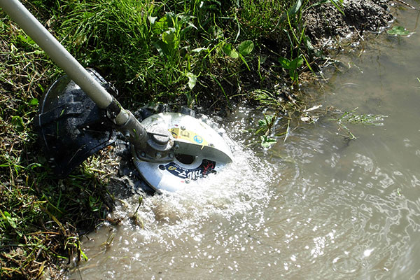 アタッチメント内部の減速機構と上下刃の回転ハサミ駆動により、低速回転でも効率よく草が刈れ、石などの飛散を抑制。また、刈刃が障害物や水に触れても跳ね返りが少ない構造の実現によって、キワ刈りや水田のあぜ等の水際でも安全に草刈りができます。