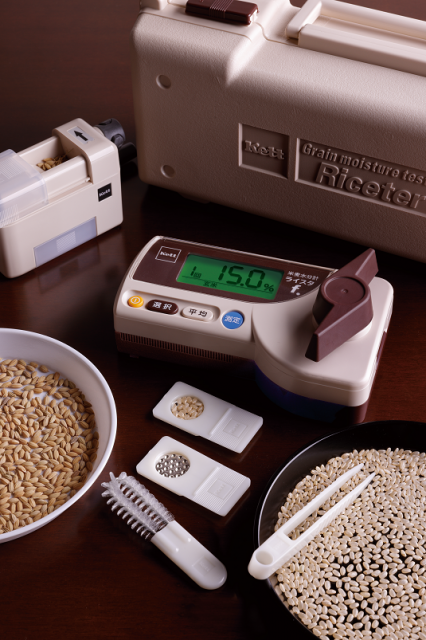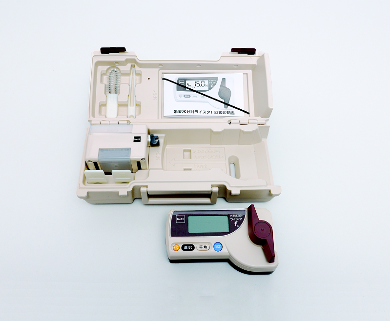 長年に渡り多くの方が愛用している米麦水分計です。ケツトといえば「ライスタ」といわれるほど、当社を代表する器種。試料皿に米を入れ、ハンドルを回して粉砕し測定ボタンを押すだけの簡単操作で、持ち運びにも便利なキャリングケース入り。「ケツトで確認すると安心だ」との声もいただいています。測定器には精度の確認が欠かせません。ケツトのライスタは、毎年全国のお客さまのもとで当社による精度の確認を実施しています。