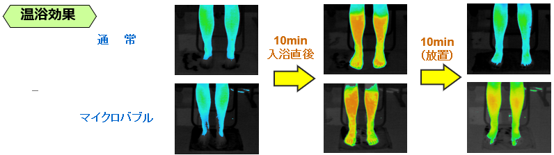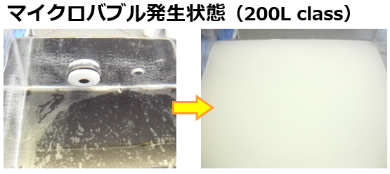 現状の泡のサイズはナノからマイクロにわたっているため、例えば浴槽にこのマイクロバブルを発生させると、入浴剤などを使用せずに白濁させることが可能です。また、装置を停止すると数分で元の透明な状態へ戻ります。