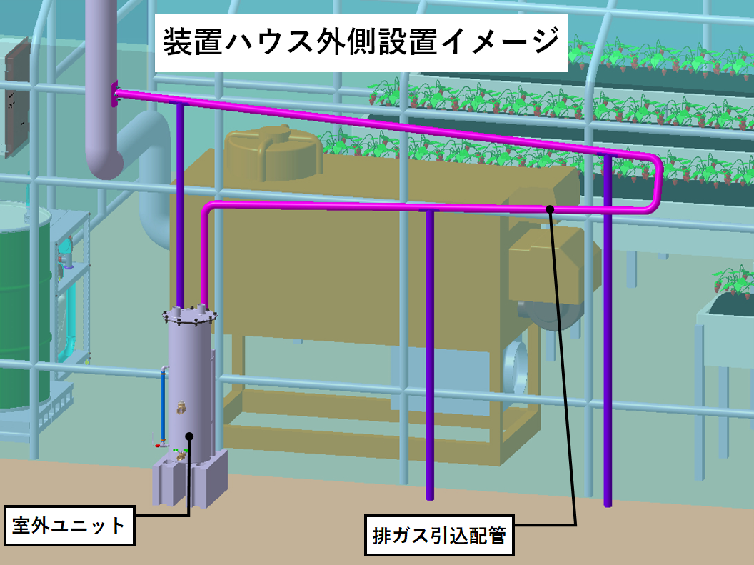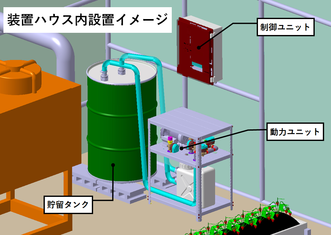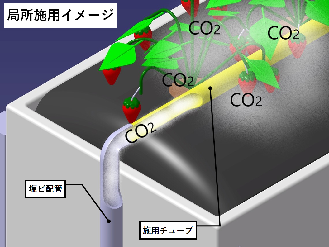 暖房機の排気ガスに含まれるCO2を浄化して貯留。光合成が盛んになる日中に、貯蔵しておいた常温のCO2を局所施用する装置。
