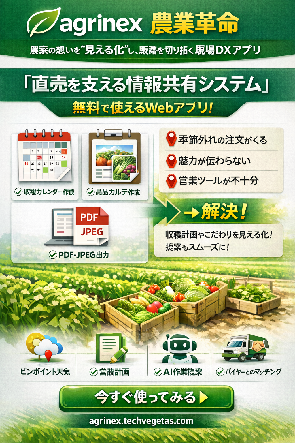 農業の現場で生まれる情報を整理・可視化し、収穫や商品、バイヤーマッチングまでをわかりやすくまとめる農業DXサービスです。
