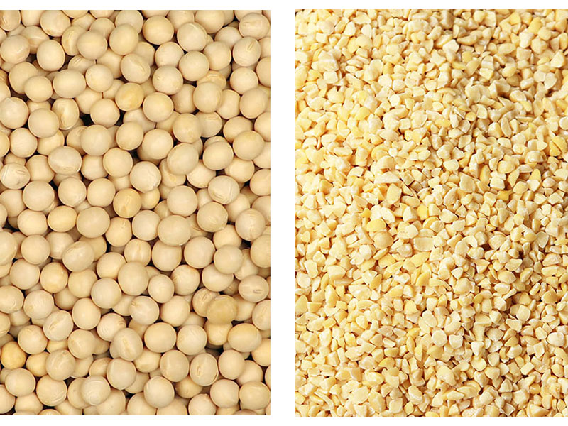 また、当製品は大きさを揃えてカットできるスクリーン式の製品です。写真は大豆のカット前とカット後で、ひきわり納豆にも最適! その他、自給飼料の製造や、製粉前の粗粉砕、廃棄物(食品残渣)の量低減などなど、多数の使用用途で活用いただけます!