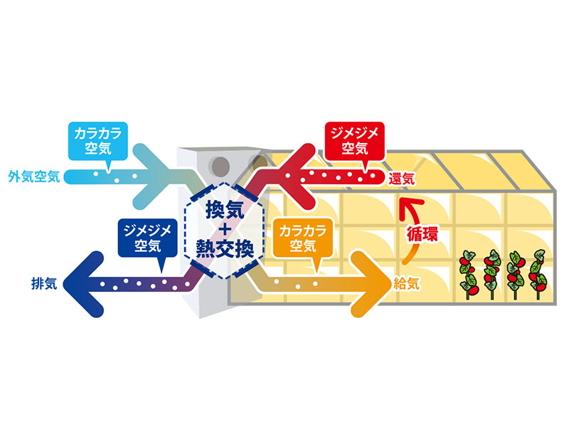 乾燥した冷たい外気の取り込みと湿った暖かい室内空気の排出を熱交換しながら同時に換気する「熱回収型除湿換気」を採用。室温低下を抑えた効率の高い除湿を行えるため、加湿機などで暖めた空気を無駄にせず、冬場のハウス内過湿対策にも最適です。多湿による病害を防ぐほか、外の空気を取り込むことでCO2濃度を下げず、作物の生育を促進できます。