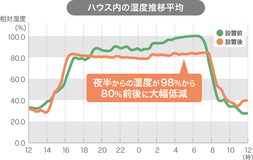 ※ハウス内より外の方が気温が高く、湿度も高い場合以外は除湿効果があります。