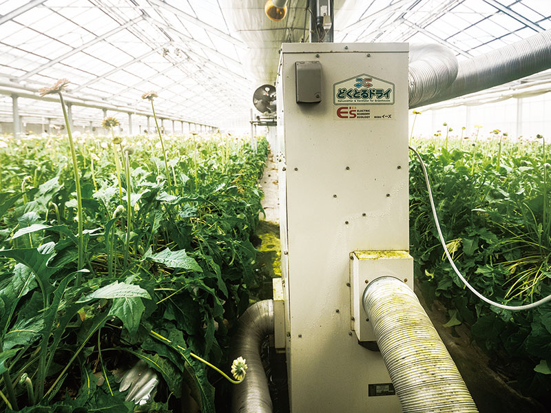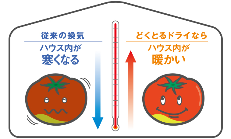天窓や扉などを開けての換気では、せっかく加温機等で暖めた空気をそのまま外に放出してしまい、暖房費が無駄になってしまいます。その点、どくとるドライは、ハウス内の暖かい空気を外へ出す際にその熱をハウス内に入ってくる空気に渡す(=熱交換する)ので、ハウス内の温度低下を最小限に抑えることができます。
