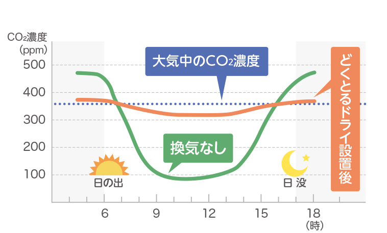 ※一般的に換気していない状態では、日中のCO2濃度は100ppm程度まで下がるといわれています。