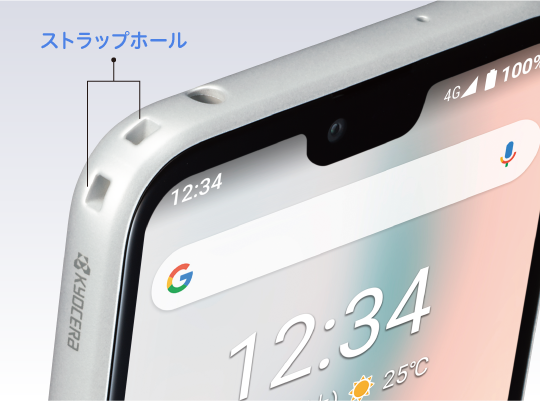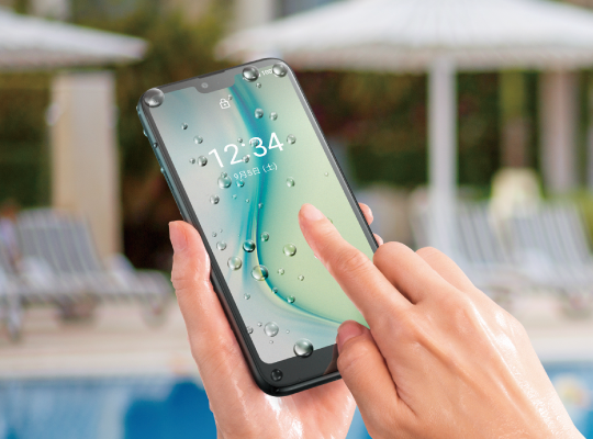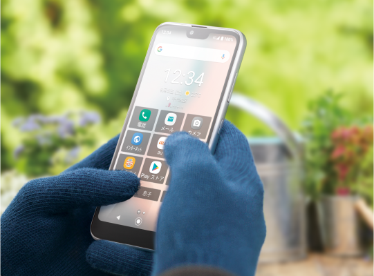 高さ1.22mから鋼板への落下試験をクリア、防水、防塵性能など圃場でのハードな使い方にも適したスタンダードスマートフォンです。見やすい約5.8インチの大画面・フルHD+ディスプレイに加え、アイコンが大きくて押しやすい画面デザインとなっており、作業中の落下防止に役立つストラップホールを搭載しています。また、都度グローブを外すことなくディスプレイが操作できる『グローブタッチ®』・ディスプレイや手が濡れていても操作できる『ウェットタッチ®』にも対応。さらにアルコールなどでのお手入れも可能です。