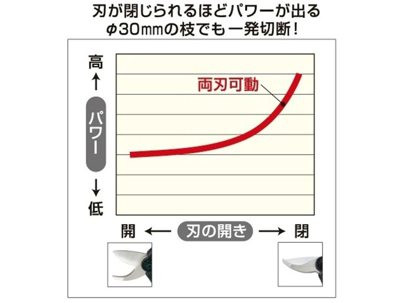 ハイパワーの秘密はマックス独自の「両刃可動」。刃が閉じられるほどパワーが出るので、φ30㎜の太い枝でも簡単に切断できます!手はさみの様な切断時の衝撃が少なく、手首・腕の疲れが軽減されます。