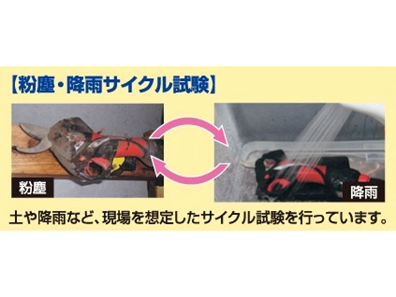 現場で使用するうえで大切な、安全性と耐環境性。当社の充電式剪定はさみは、「トリガロック」と「本体スイッチ」で2重に不意の作動を防止できます。タフネスにも自信があり、現場を想定した条件での粉塵・降雨のサイクル試験(※)もクリアした、長くお使いいただける製品です。