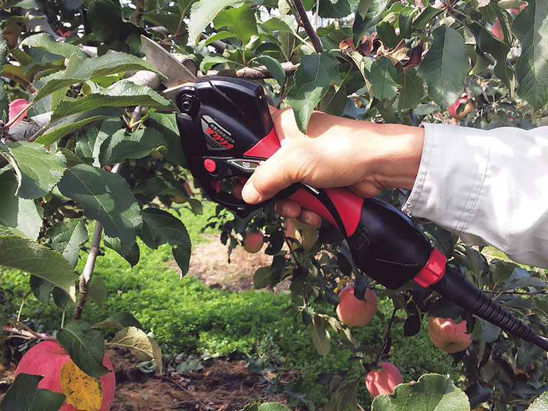 独自の両刃可動でハイパワー&キレイな切り口! 梨・梅・柿・桃・ぶどう・柑橘類など果樹の剪定作業に便利な充電式剪定はさみ。