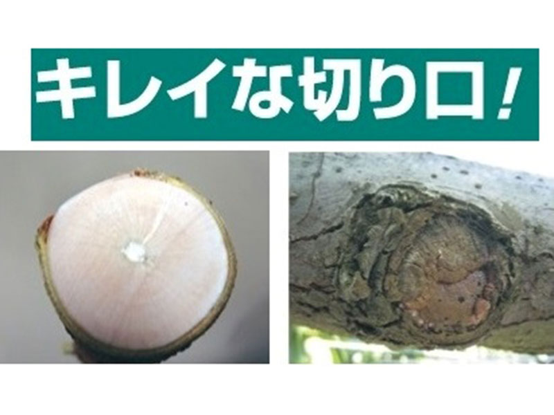 また、徹底研究した日本製の刃で一気に切った切り口はシャープできれい。キレイな切り口は、果樹の健康を左右する、カルス形成に大きな影響があるため、特にこだわって商品を作り込んでいます。