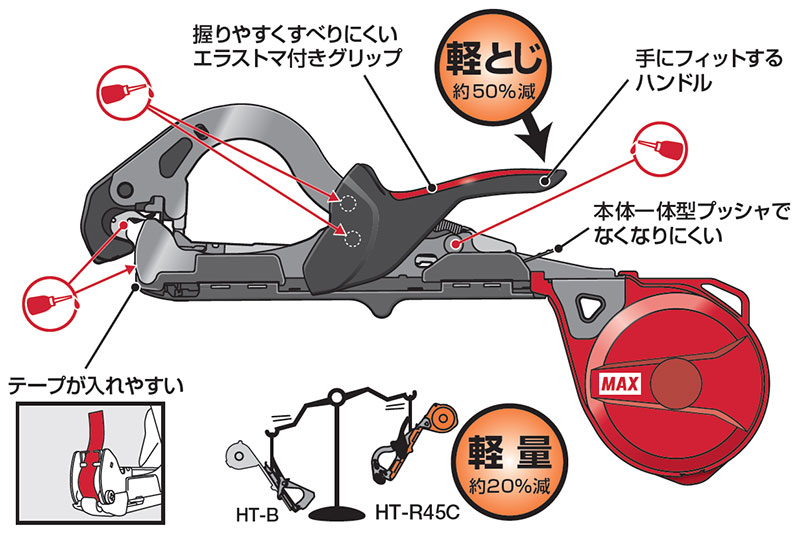 1969年から始まるテープナーの歴史で、お客様から寄せられた膨大なご要望をできる限り盛り込んだ新製品。当社旧型機HT-B(NS)に比べて操作する力は50%軽減、本体の質量は20%軽減。その他、グリップに滑り止め&衝撃吸収のエラストマの追加、ステープルを押し込むプッシャが無くならない構造など、使いやすさをアップさせる工夫をたくさん詰め込んでいます。最近では、トマトの吊り下げ誘引でも導入すると効率が上がる等、採用が広がっています。