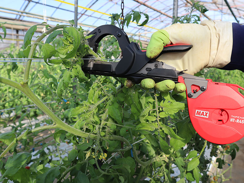 《愛知県 トマト農家様/吊り下げ誘引》グリップについた滑り止めのおかげて、親指の付け根が全く痛くなりません。以前は誘引にクリップを使っていましたが、テープナーを導入してから2、3倍速くなりました。プッシャがなくならないのもいいですね。