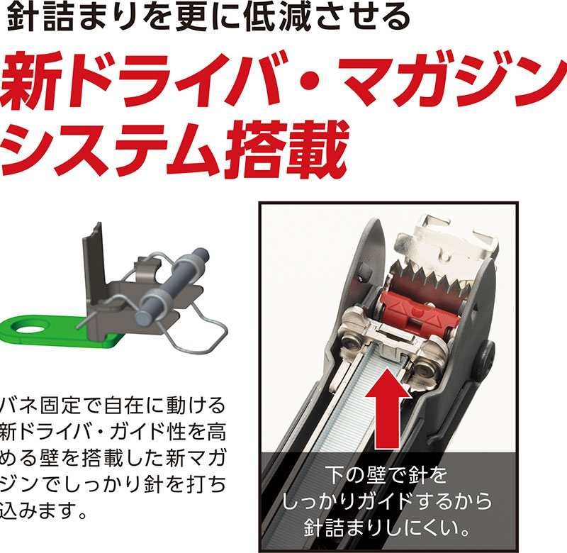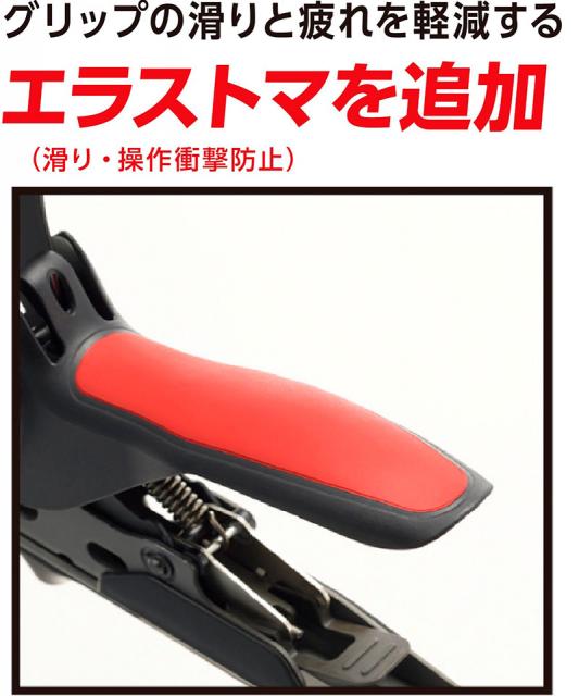 誘引作業の能率、手作業の約3倍に一挙にアップ!針詰まり低減、滑りと疲れを軽減するエラストマ付グリップを採用し、使い易さにこだわったテープナーです。