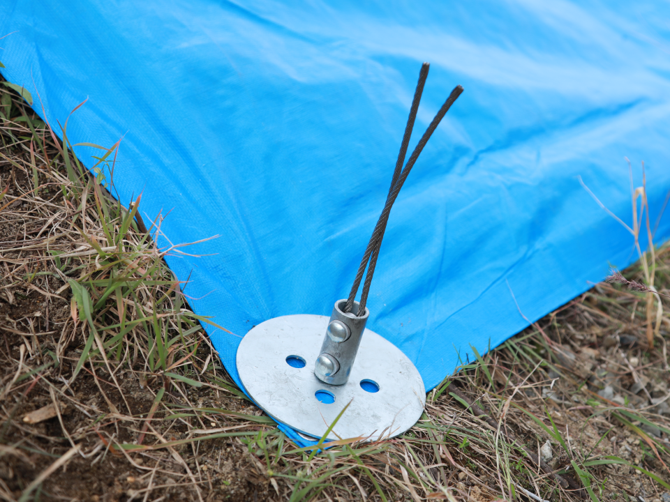 大雨が引き起こす土砂崩れや崩落などを未然に防ぐための雨水浸透防止シートの設置や法面の補強・補修の保護対策にお使いいただけます。人力のみで施工ができ、地盤の状態に合わせてアンカー固定の深さが自由に設定できます。