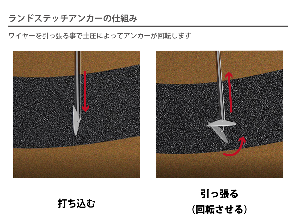 専用の打ち込み棒で支持層まで打ち込み、ワイヤーを引っ張りアンカーを回転させてしっかり固定。支持層の深さに関係なく使用でき、軟弱基盤や傾斜地にも対応します。