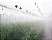 ハウス内に設置したスプレーノズルからセミドライフォグ®(10~30μmサイズの霧)を発生させ、気化熱による冷房と加湿により、温湿度にムラのない均一な栽培環境をつくります。 栽培作物や設備などを濡らすことがなく、また噴霧開始-停止時に水滴が落ちない(ぼた落ちが起きない)機構です。