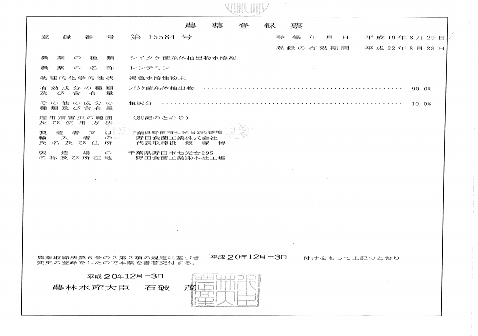 シイタケ菌糸体抽出物を有効成分とするウイルス病防除・植物調節剤。モザイク病を発現するウイルスの感染防止剤で国内唯一の農薬登録剤です。