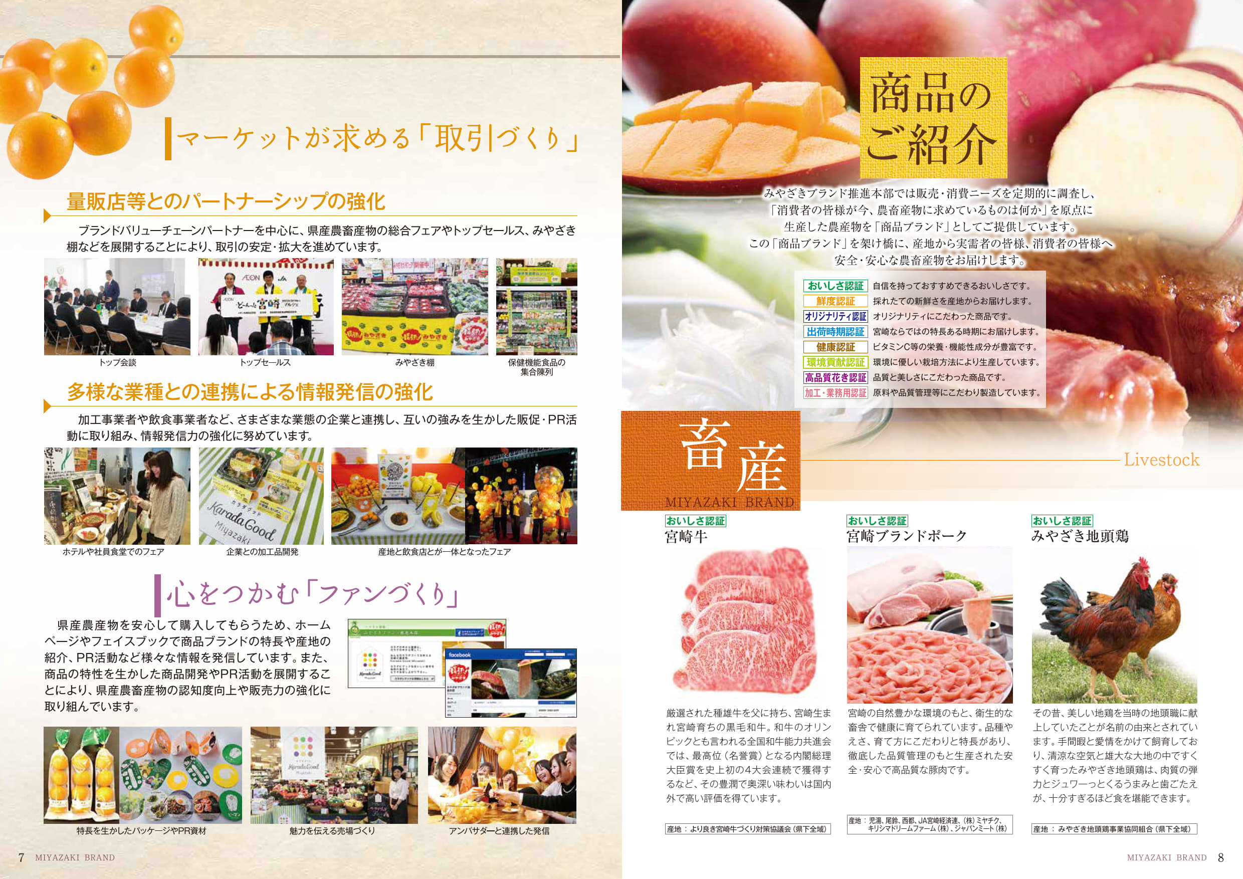 みやざきブランドは「産地づくり」、「人づくり」、「物流体制づくり」、「商品づくり」、「取引づくり」、「ファンづくり」の6つの戦略を柱に、生産、流通、販売の各分野の関係者が連携し、「新たな価値を創出し、信頼と情熱が次ぎの世代につながるみやざきブランド」の実現を目指します。