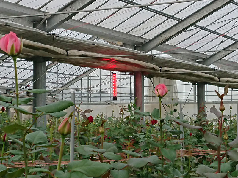 アザミウマ防除に効果的なモスバリアジュニアII レッド。日中点灯してアザミウマの拡散を抑制します。100V電源で、ハウスで吊り下げて使用。殺虫効果はありませんが、行動を抑制することで、害虫の個体数、作物の被害率、農薬散布の回数を減らし被害減少に効果があります。露地では専用金具と単管で簡単に設置可能。お客様のハウスの広さ、圃場の形に合わせて設置個所等をご提案致します。
