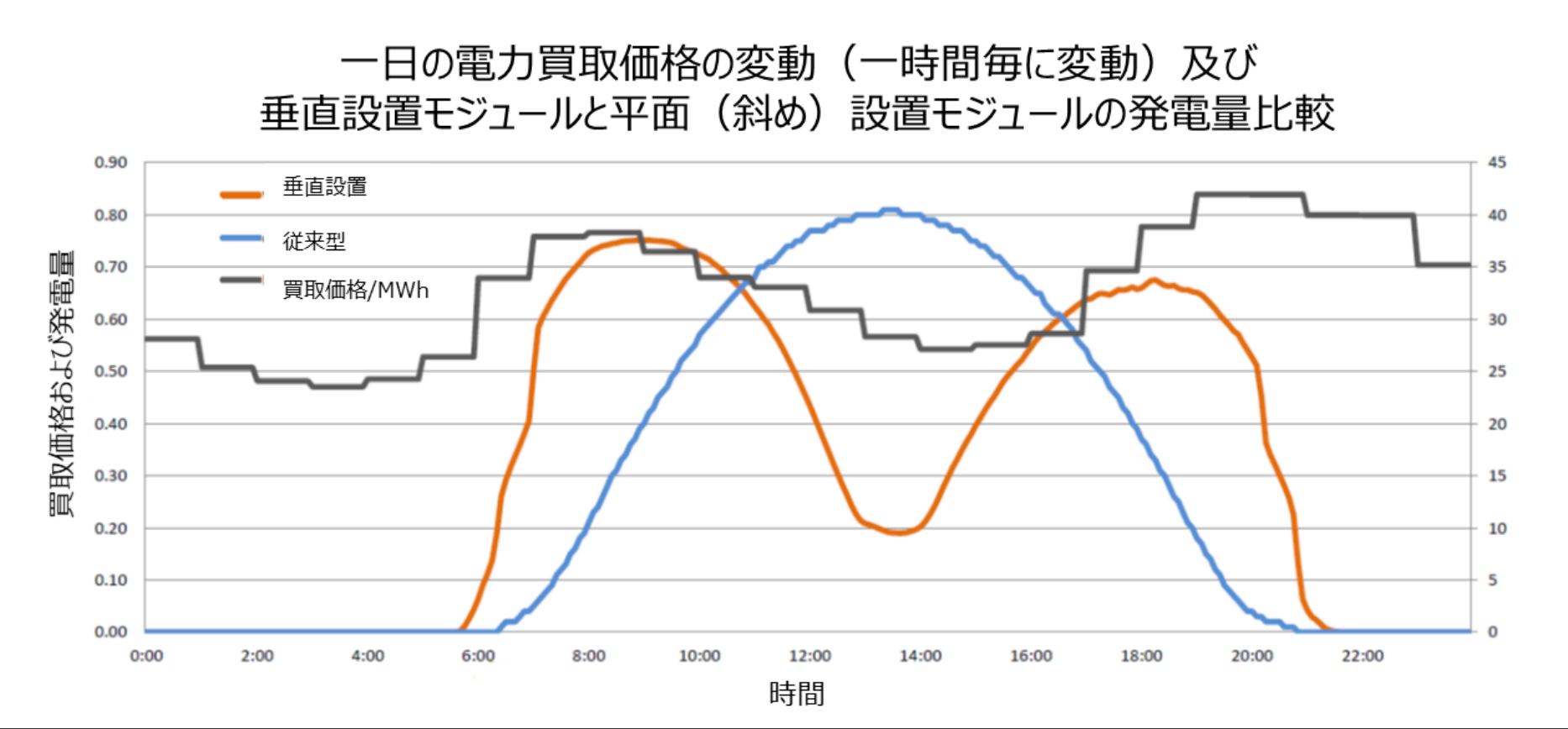 電気の買取価格は朝と夕方に高くなるため両面ガラスモジュールを垂直に設置すれば、買取価格が高い時間に発電量も高めることが可能です。これによって従来よりも高い収入を得ることができるのです。