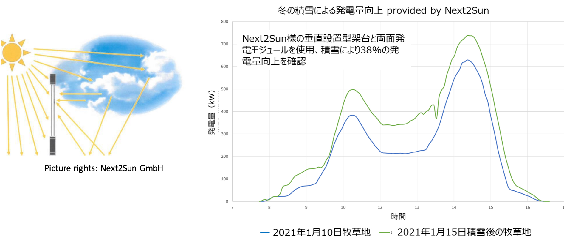 垂直垂直設置及び両面ガラスモジュールの使用により15%以上の発電量の向上が期待でき、さらに積雪の状況によっては30%以上の発電量向上が期待できます。