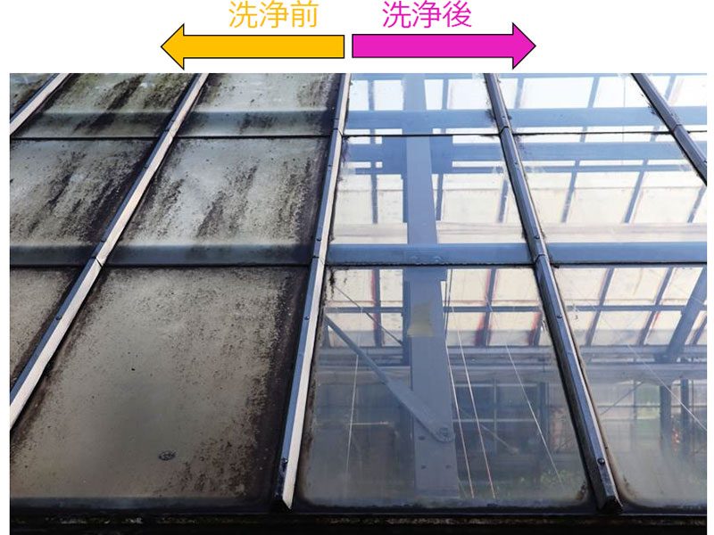 ブラシをかけたところとまだのところを比べたら一目瞭然! 効果的に汚れを落とすため、ブラシはハウスの素材や汚れ具合に合わせて3種類ご用意。ガラス温室のしつこい汚れには「ナイロン硬質ブラシ」、ガラス温室・ビニールパイプハウスには「ナイロン軟質ブラシ」、ビニールハウスには「ゴムブラシASSY」をオススメしております。