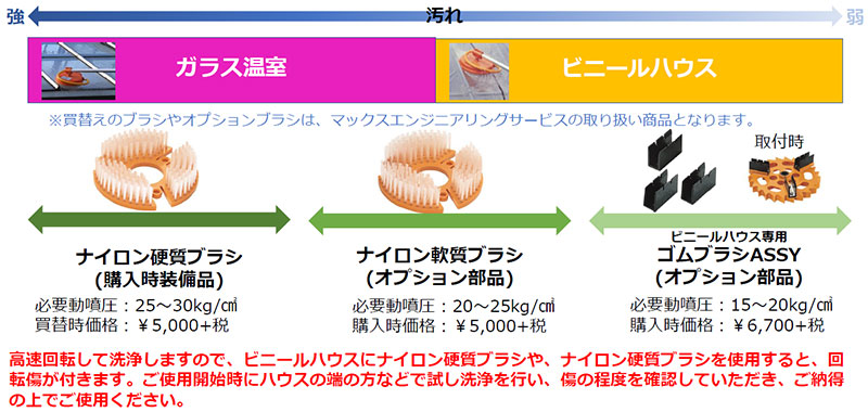 ハウスの素材、汚れに合わせてブラシを用意。高い洗浄性能を発揮します!