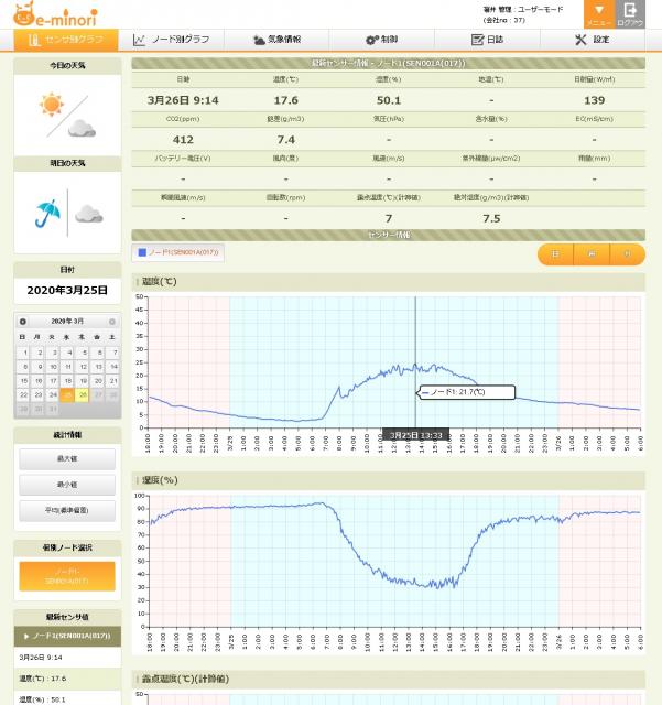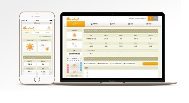 温度、湿度、CO2濃度、飽差などを測定し、測定データは自動でクラウドにアップされ、お手元のスマホやPCからいつでもどこでもデータを確認できます。