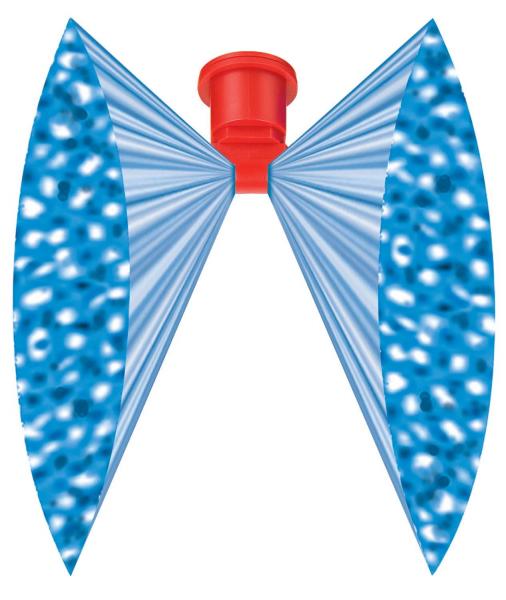 ■2つのフラットスプレーが60°の角度で噴射、ひとつは進行方向前面に、もうひとつは後方に向かって散布することで、葉裏や葉の隙間など広範囲への散布が可能となります。繁茂部分に強力に浸透し、各種薬剤を確実に到達させます。
