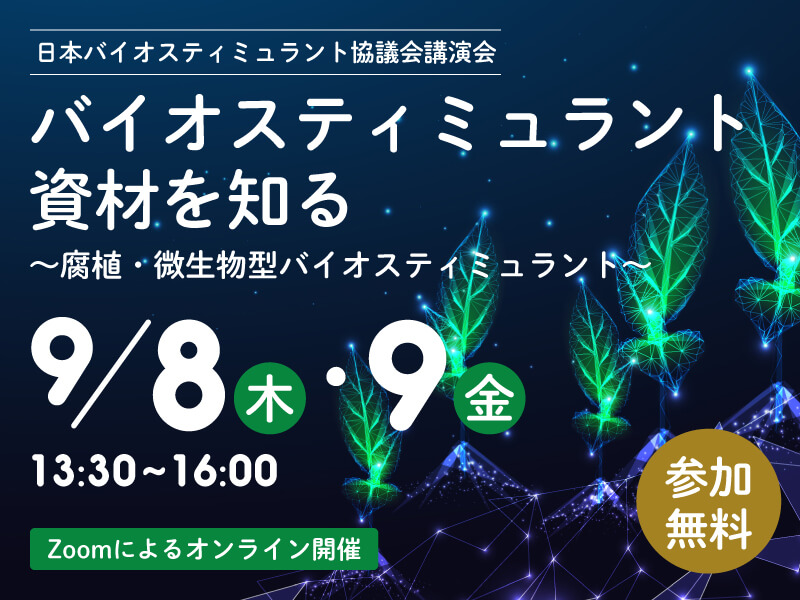 本セミナー『バイオスティミュラント資材を知る~腐植・微生物型バイオスティミュラント~』は、日本バイオスティミュラント協議会による講演会で、バイオスティミュラントの研究成果や、生産現場でどのように使用されているのかの最新動向などについて知識を深めることができます。