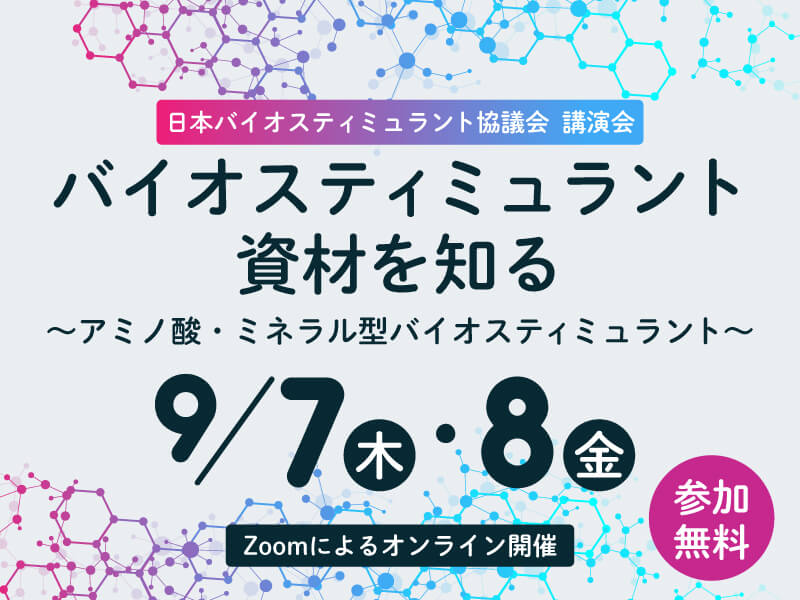 新しい農業資材「バイオスティミュラント」の基礎知識と最新の動向を知ることができるセミナーが、好評につき今年も開催されます。 今回のテーマはアミノ酸・ミネラル型。バイオスティミュラントに興味がある業界関係者や農業生産者必見の講演会です。