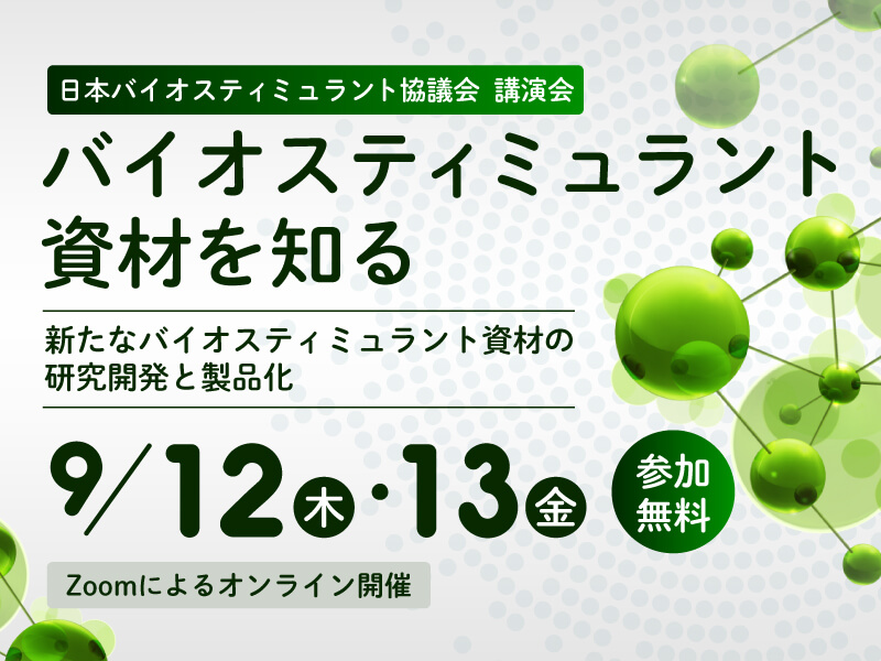 新しい農業資材「バイオスティミュラント」の基礎知識と最新の動向を知ることができるセミナーが、好評につき今年も開催されます。 今回のテーマは新たなバイオスティミュラント資材の研究開発と製品化。バイオスティミュラントに興味がある業界関係者や農業生産者必見の講演会です。