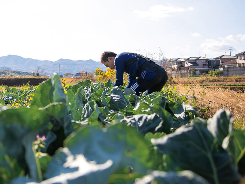 メイン画像:11時の出荷に間に合わせるため、朝6時頃から3時間ほど、前かがみの姿勢でブロッコリーを収穫する。「メディエイド アシストギア」を身につけると、肩と太もも部分のパーツで生まれる張力が効き、腰にかかる力が分散される。