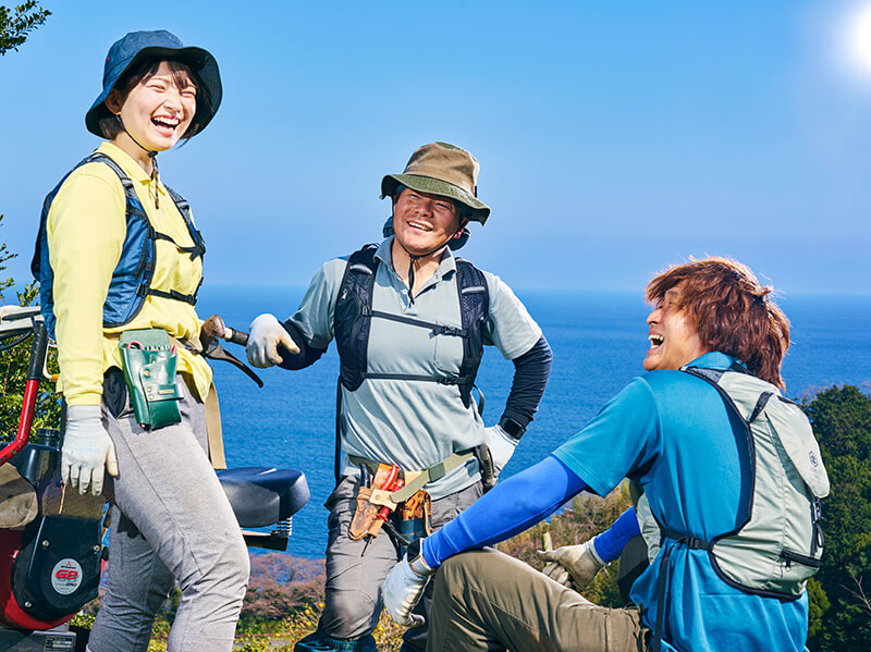 矢郷農園の高橋さん、矢郷さん、槇さん(左から)。神奈川県小田原で、相模湾の汐風と太陽をめいっぱい浴びたミカン、レモン、キウイ、オリーブなどを生産・加工・販売。
