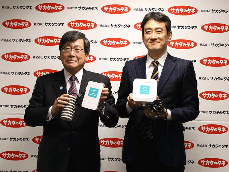 記者見学会において、サカタのタネ代表取締役の坂田宏氏が環境制御システム「アルスプラウト」のモニタリング向け新モデルとして「Arsprout Air(アルスプラウト エア)」を発表した。共同開発したアルプスラウト社からは代表取締役の戸板裕康氏が出席(タイトル写真)した。