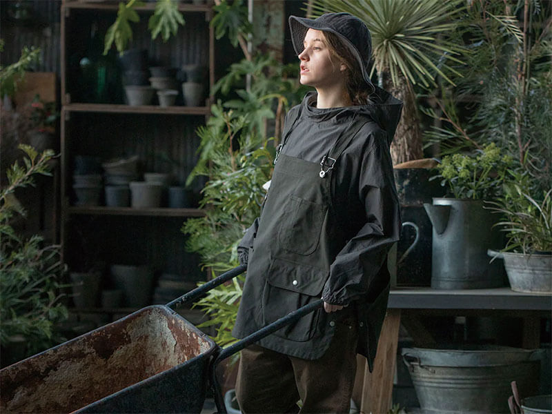 フローリスト向けに作られた、フード付きの割烹着(かっぽうぎ)のような、スモックタイプのかぶり。作業時に花束や道具を入れる事ができる大きなポケットがフロントに配置されている。袖口にはゴムを入れて水場での作業時等に腕をまくりやすいよう配慮されており、農業現場でも便利かつオシャレに着こなせる。