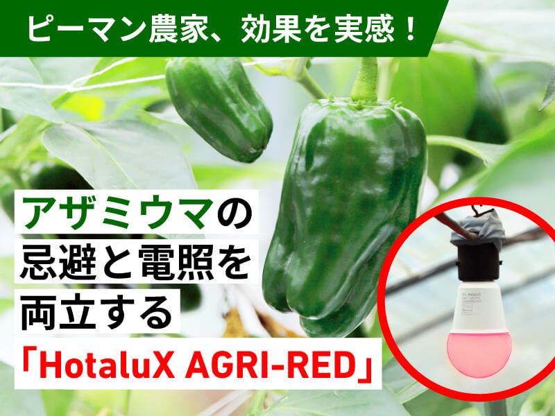 多くのピーマン農家を悩ませるアザミウマ。そんなアザミウマを農薬ではなく、赤い光で抑制する農業用照明「HotaluX AGRI-RED(赤色LED電球)」を「株式会社ホタルクス」が開発した。国内照明メーカーであるホタルクスが2023年から順次発売した農業用照明シリーズ(AGRI SHINE)のうちのひとつである。
