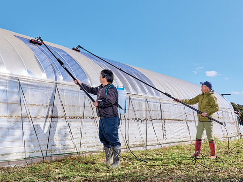 作物の栽培や苗づくりに欠かせない農業用ビニールハウスを長持ちさせたい。そんな思いで開発されたハウス専用クリーナーと、三脚メーカーのブラシを組み合わせて、素早く清掃を行う現場をレポート!