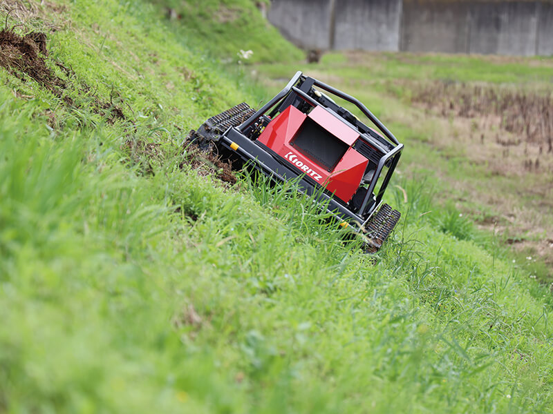 本システムを搭載することで、難易度の高い制御が可能に。例えば傾斜地では、谷側のクローラの速度を上げて、走行の直進性をアシストする機能がある。また、クローラを左右逆回転させることでその場で旋回できるなど、狭い圃場でも小回りが利き、ストレスのない草刈り作業を実現。作業効率の向上にもつながる。さらに、ラジコン草刈機が苦手とする「法肩」も難なく刈れるという、かゆい所に手が届くような刈高さ調整となっている。