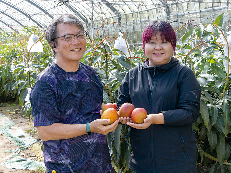 約40年前に卓也さんの両親がはじめた農園を引き継ぎ、沖縄県国頭郡東村で妻のゆかりさんとともにマンゴーやパイナップルの栽培を行う。6棟のハウスには、アップルマンゴー(アーウィン)、レッドキーツ、てぃらら、金蜜の4種のマンゴーの木が植えられ、7月から8月に収穫のピークを迎える。