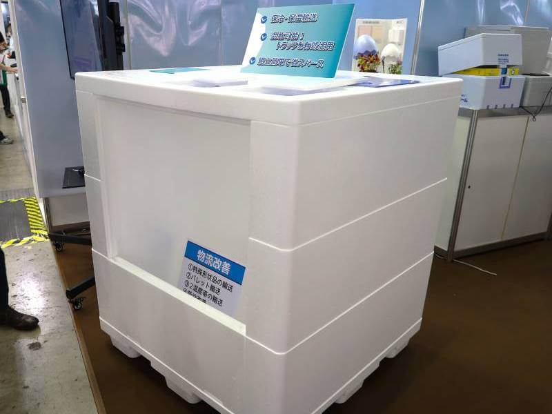 そこに利用できそうな製品を展示していたのが、大阪に本社を置く、発泡スチロール成型品製造及び販売を主業とするトーホー工業。発泡スチロール製の大型コンテナ「EPSスマートクーリングコンテナ」を展示していた。